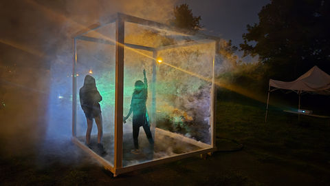 An 8-foot cube that projects 3D holograms onto a dynamic fog matrix, where attendees can observe from a distance or step inside for a fully immersive, interactive experience.